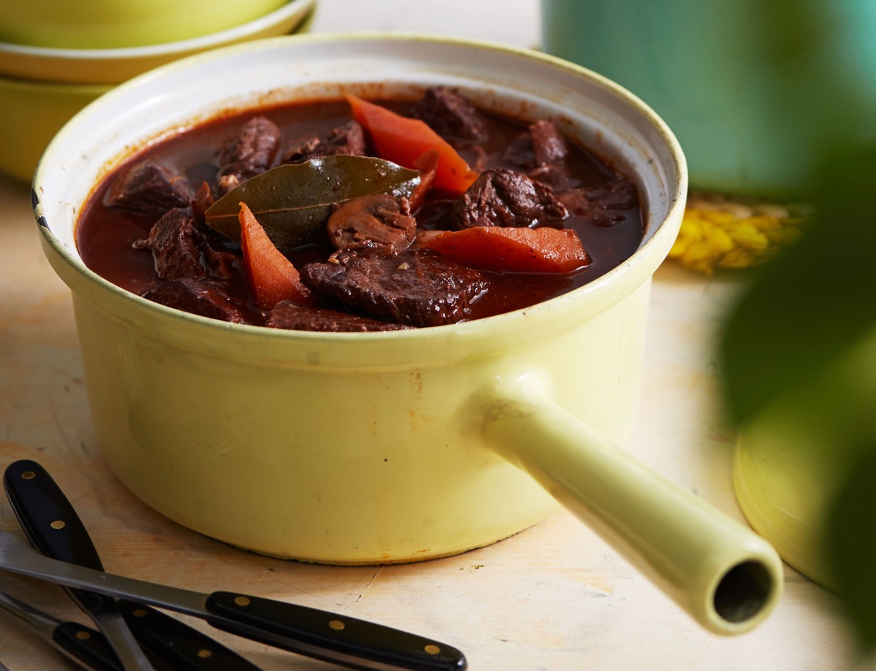 Liha hautuu punaviinissä mureaksi. Pekoni, valkosipuli ja sienet saavat seurakseen myös porkkanaa ja tomaattipyreetä.