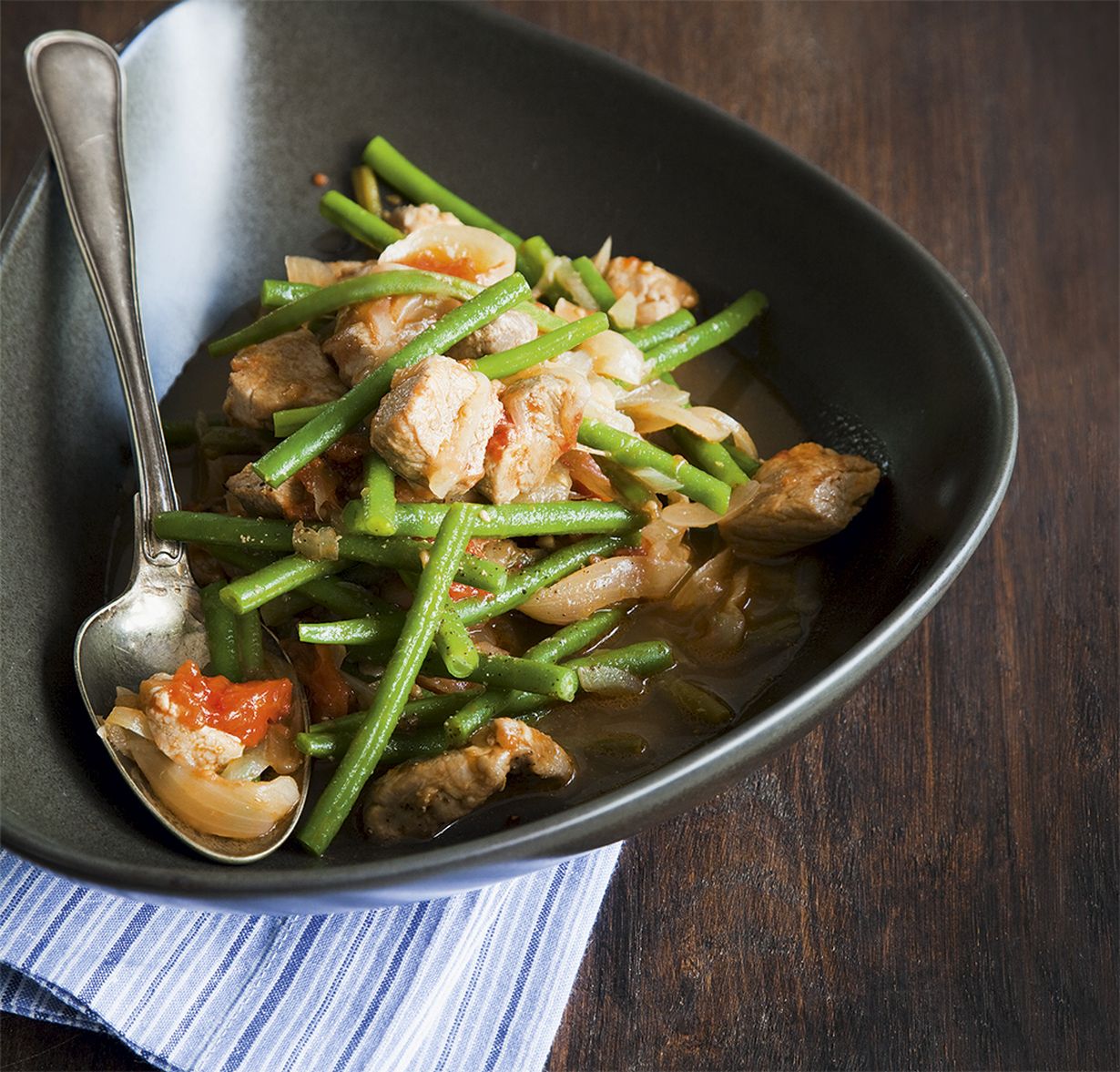 Keittele ruokaa pienellä lämmöllä kannen alla 20-30 minuuttia. Valuta purkkipavut ja lisää pataan muhimaan vihreiden papujen ja kyntelin kanssa noin 10 minuutiksi.