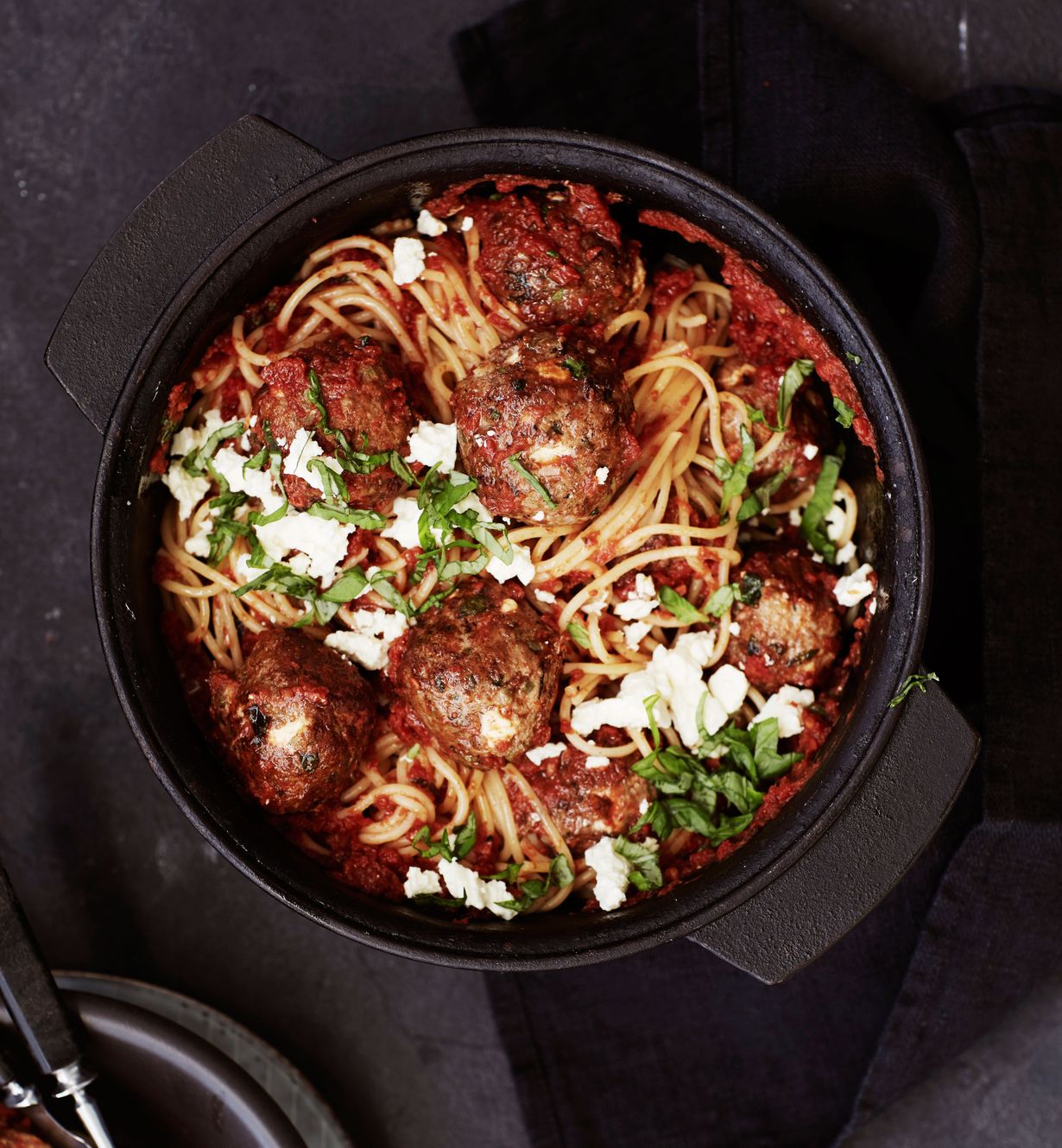 Keitä spagetti suolalla maustetussa vedessä. Valuta. Sekoita lihapullakastike spagettiin.