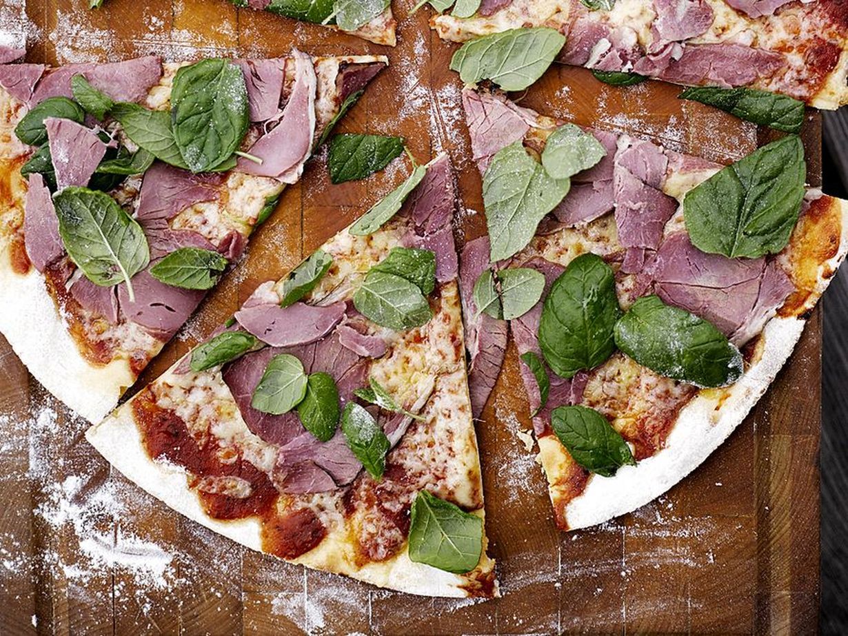 - Leikkaa pizzan paistuessa savulammas ohuiksi siivuiksi. Levitä siivut sekä mintunlehtiä paistetulle pizzalle.