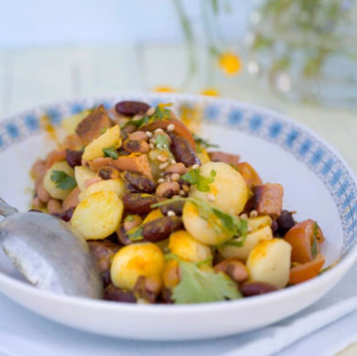 - Lisää peruna-makkaraseokseen papu-herne-kastikeseos.