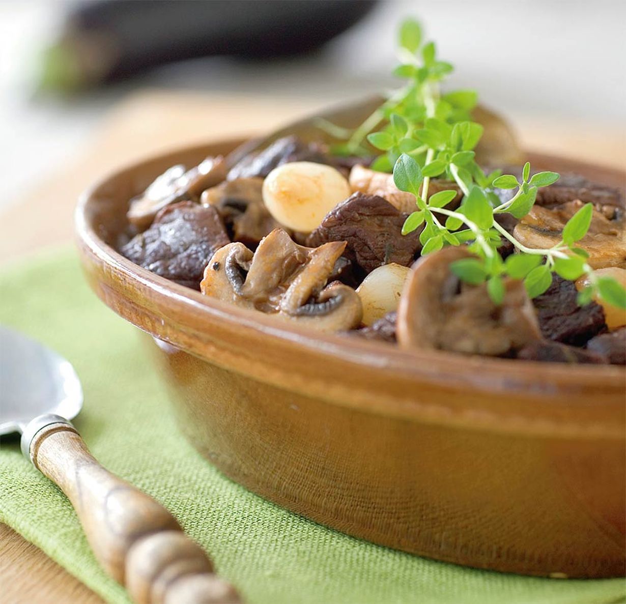 Leikkaa liha reiluiksi kuutioiksi. Kuori ja lohko sipulit. Viipaloi sienet. Ruskista kaikki pienissä erissä pannulla tai padassa. Kaada kaikki voideltuun uunivuokaan tai pataan. Ripottele päälle jauhot.