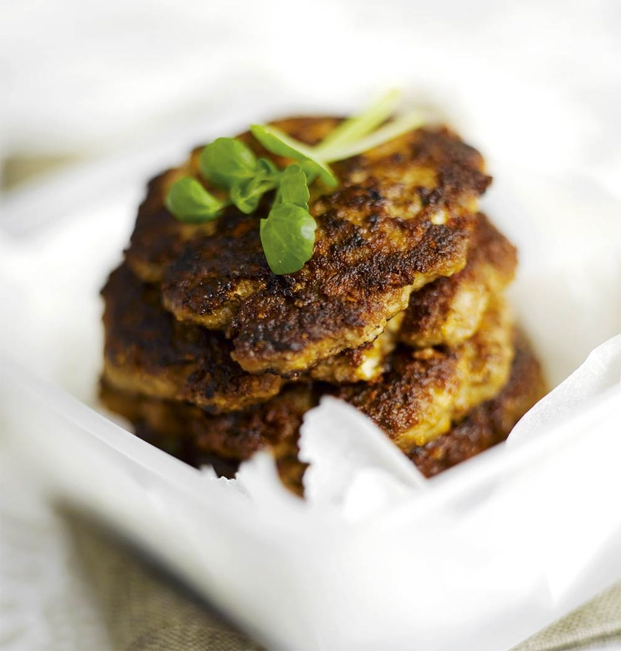 Jauhelihapihvien sisältä löytyy fetaa ja tuoreita yrttejä.