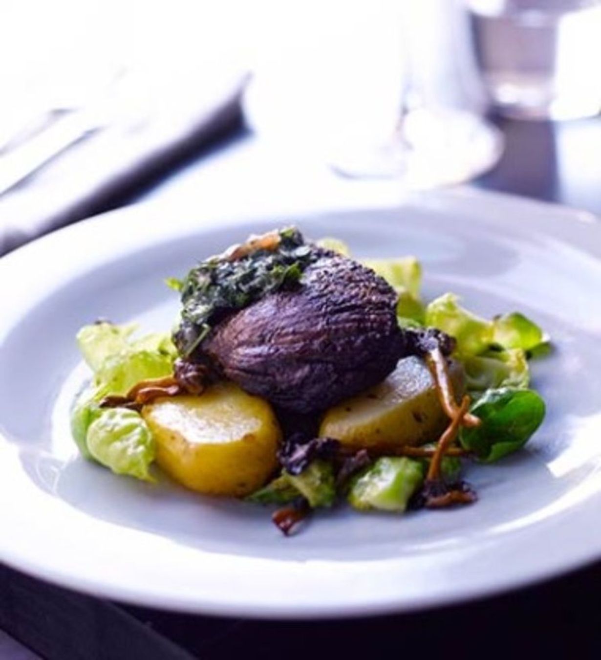 Paista sillä aikaa sieniä kuumalla pannulla öljyn ja voin seoksessa pari minuuttia. Lisää sekaan keitetyt, puolitetut perunat ja hetken päästä siistittyjen ruusukaalien irti nypityt lehdet. Kokoa annoksiksi. Asettele lautasten pohjalle paisti ja sen ympärille paistettua kasviseosta. Viimeistele annos valuttamalla paistin pinnalle anjovis-persiljaöljyä.