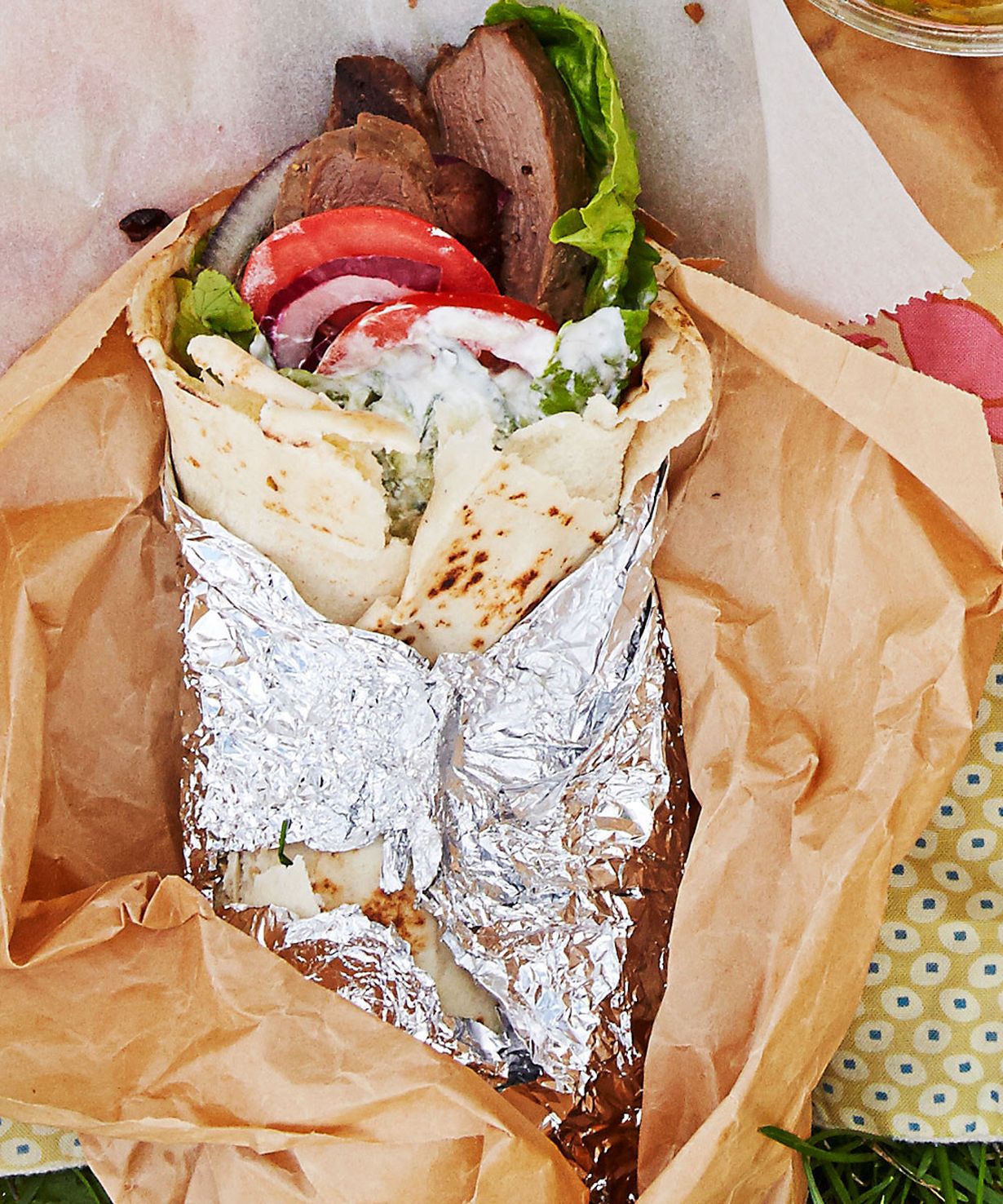 - Viipaloi tomaatti, punasipu-li ja paistettu liha. Kasaa täytteet leivälle tai rieskalle ja kääri gyros tiukaksi rullaksi leivinpaperiin.