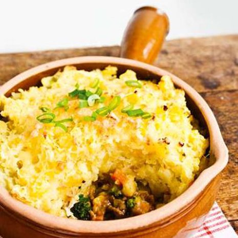 Hiljakseen hautuvasta paistista, suolakurkuista ja aurajuustosta syntyy syntisen herkullinen pata.
