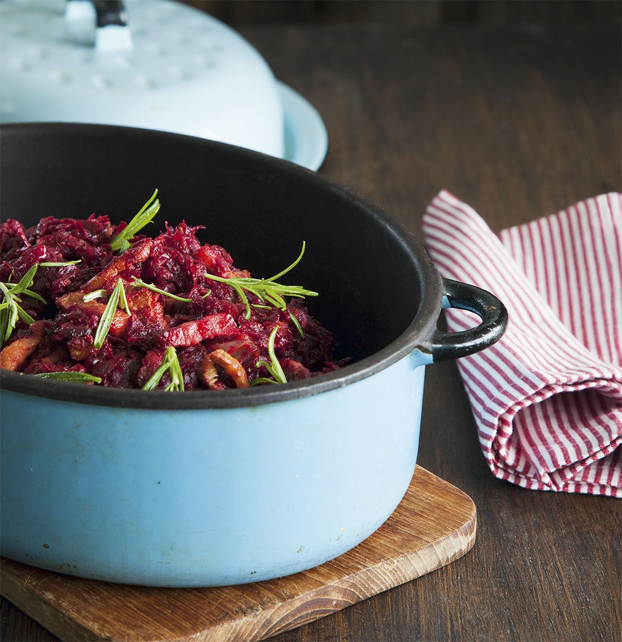 - Kuullota sipuleita öljyssä pari minuuttia. Lisää possu pataan ja ruskista hieman. Lisää sen jälkeen punajuuriraaste ja alenna lieden lämpöä. Kypsennä ruokaa, kunnes punajuuri on kutistunut kasaan. Mausta makusi mukaan.