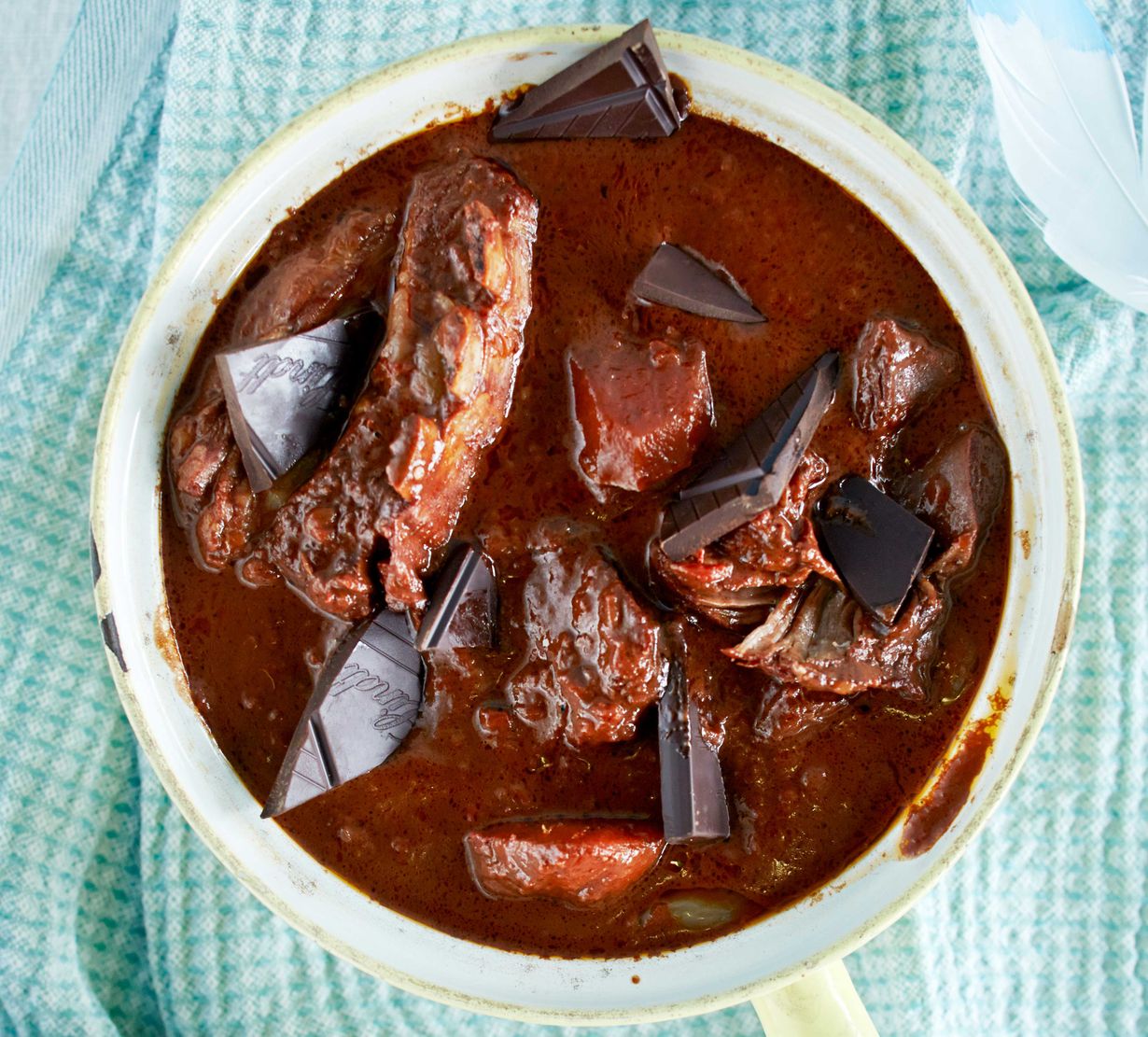 - Paloittele suklaa ja lisää pataan. Sekoita niin, että suklaa sulaa liemeen tasaisesti.