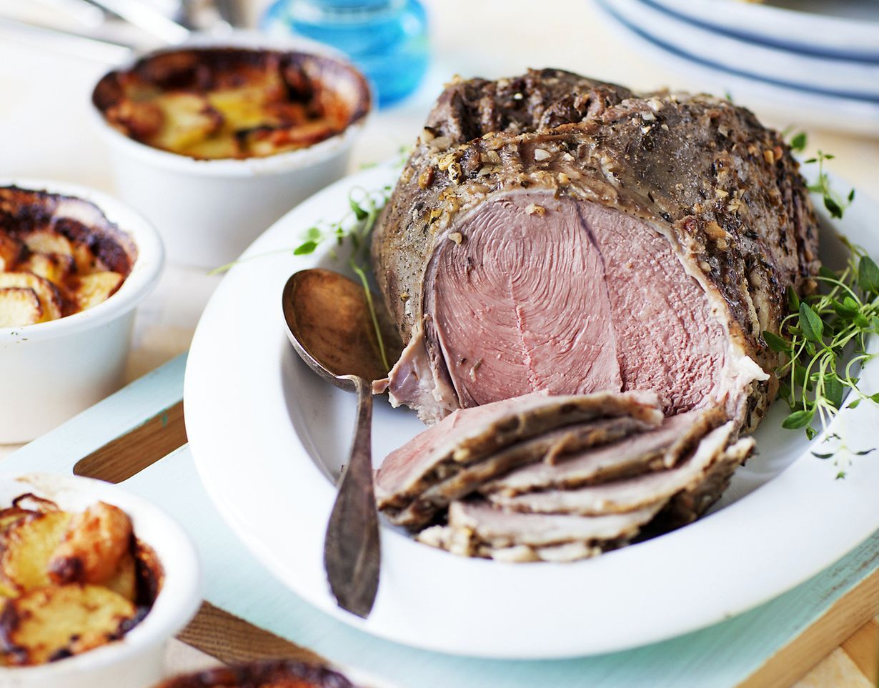 Karitsanpaisti maustuu mureaksi yrttisessä valkoviinimarinadissa. Paisti saa jäädä sisältä roseeksi.