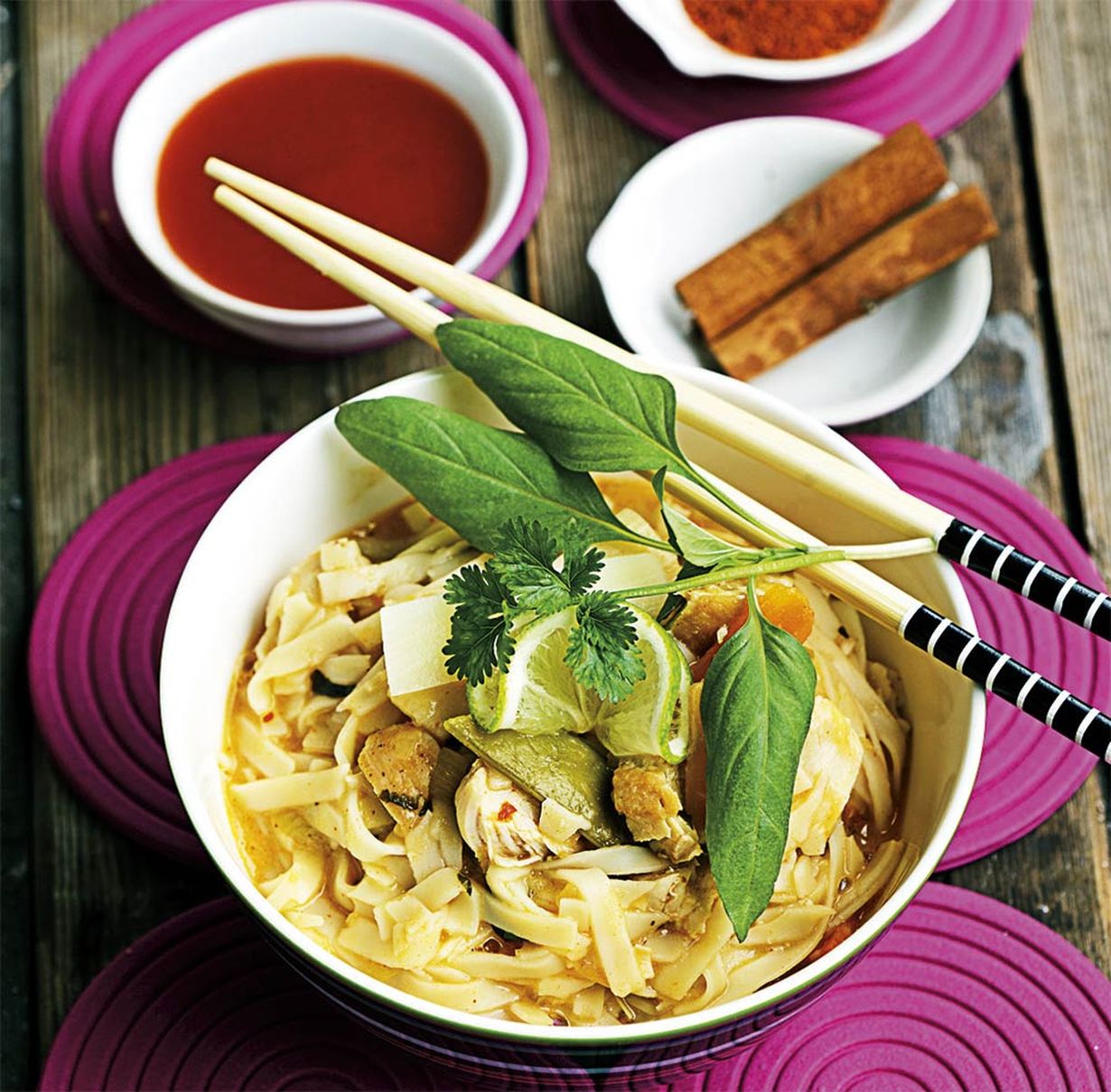 Keitä nuudelit kattilassa ja kumoa ne muiden ainesten joukkoon. Koristele annos limetin lohkoilla ja korianterin lehdillä. Tarjoa heti.