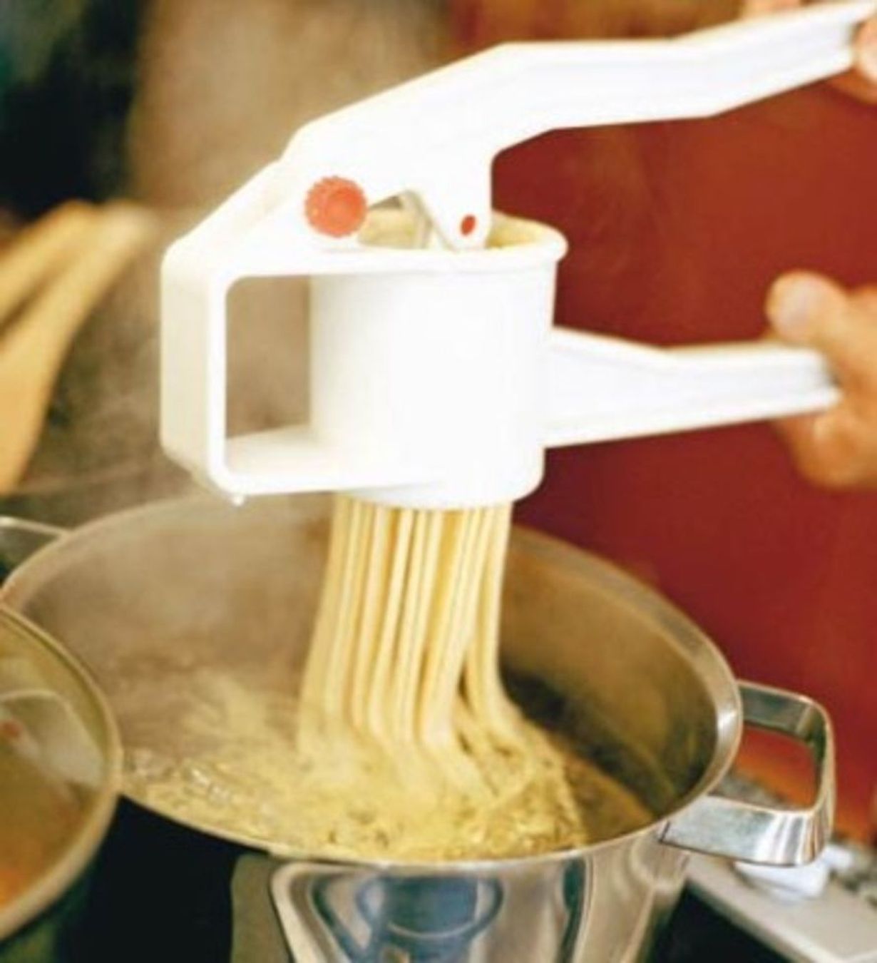 - Purista nuudelimassa perunamuhennoksen teossa käytettävän puristimen läpi, suoraan voimakkaasti kiehuvaan ja suolattuun veteen.