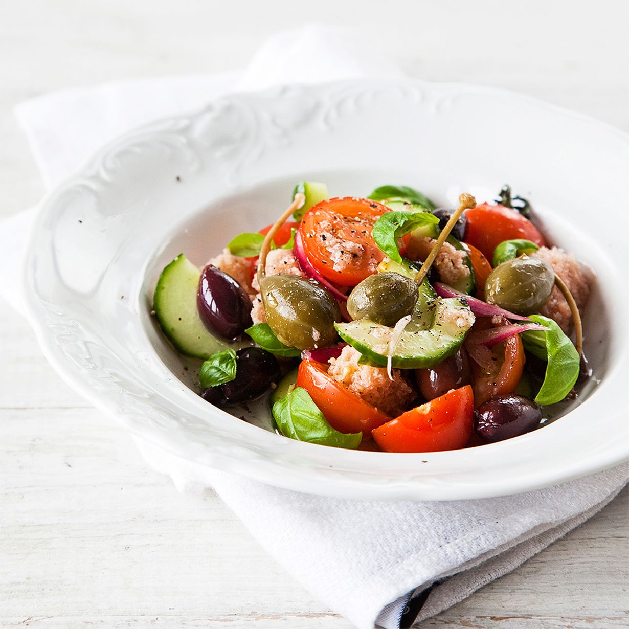 3. Puolita tomaatit. Kuori kurkku halutessasi ja kuutioi se. Laita kasvikset leipäpalojen joukkoon kapristen ja oliivien kanssa. Anna maustua viileässä noin tunti. Lisää salaattiin basilikanlehdet juuri ennen tarjoilua.
