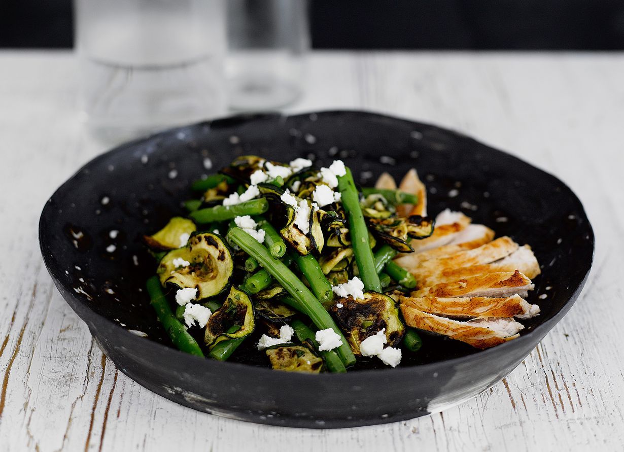 - Pane lämpimät kesäkurpitsaviipaleet ja pavut isoon kulhoon. Lämpiminä kasvikset imevät kastiketta paremmin.