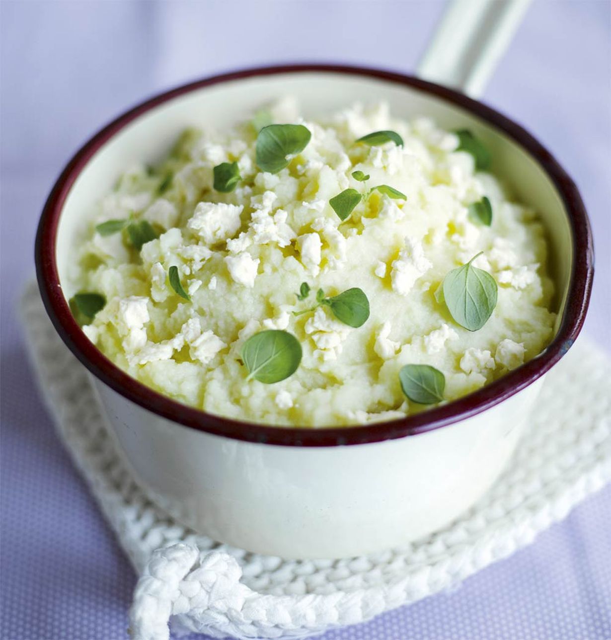 Lämmitä maito haaleaksi ja lisää se vähän kerrallaan soseeseen. Lisää joukkoon öljy, murusteltu feta ja oregano. Vatkaa muusi ilmavaksi sähkövatkaimella. Mausta pippurilla ja tarjoile vaikkapa kalan kumppanina.