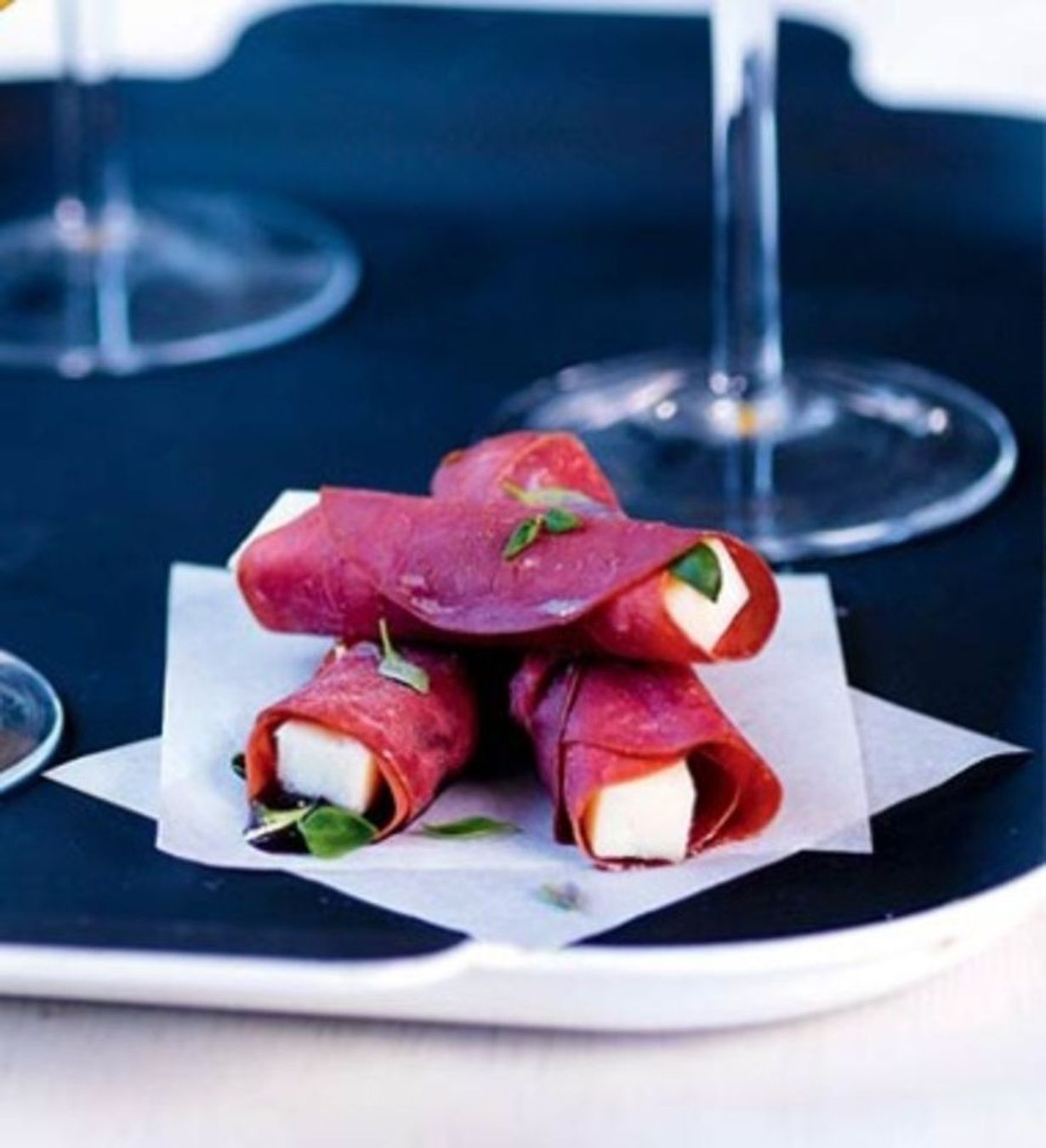 2. Levitä poroleikkeleet työtasolle ja laita jokaiselle viipaleelle noin teelusikallinen mustaherukkahyytelöä. Kieputa juustot savuporoviipaleiden sisään.