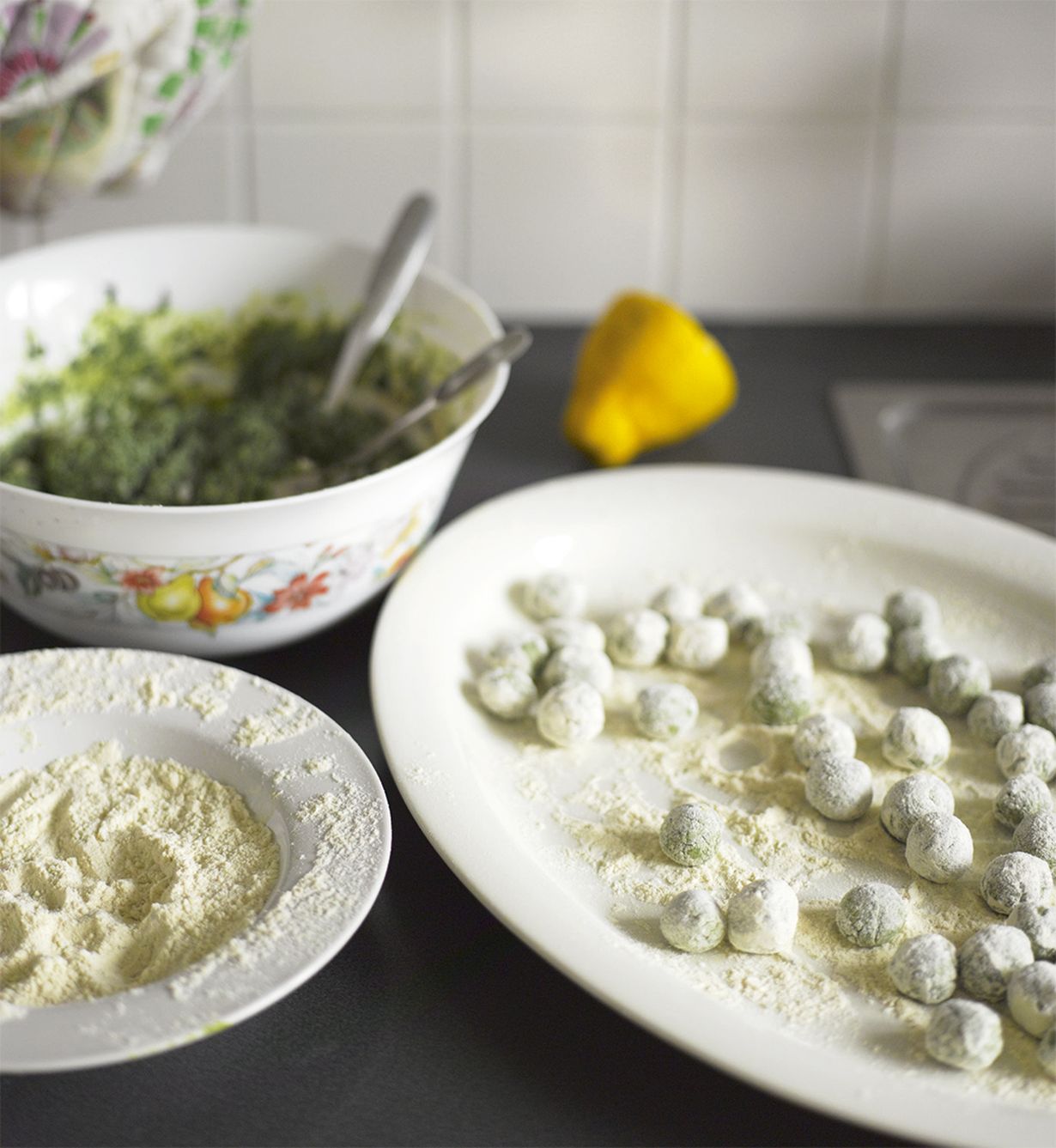 Lisää sen verran jauhoja (1-2 rkl), että saa aikaiseksi kiinteän taikinan. Älä käytä liikaa jauhoja, tai gnoccheista tulee liian kovia. Mausta suolalla ja muskotilla. Pyörittele taikinasta pieniä palloja jauhotetuin käsin.