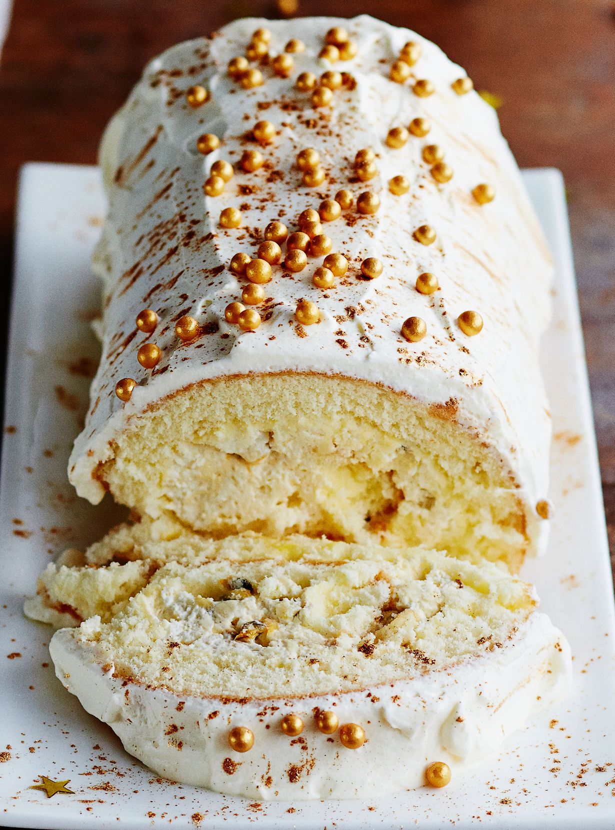 Nosta kääretorttu tarjoiluvadille. Levitä maustamaton kermavaahto tortun pinnalle. Koristele kultaisilla koristerakeilla ja syötävällä glitterillä.