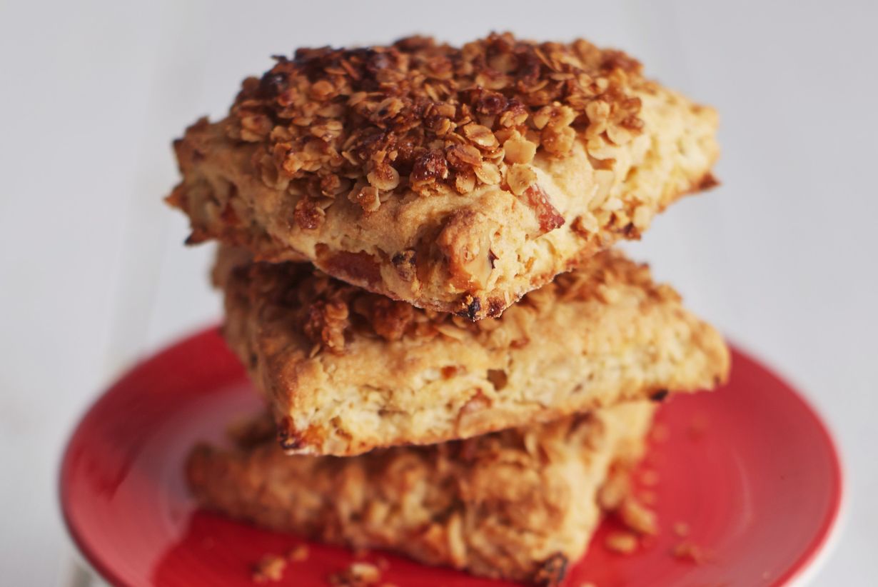 Sekoita sämpylätaikina sillä välin kun uuni kuumenee. Nopeat skonssit saavat makunsa omenaraasteesta ja päälle tehdään kauratosca omena-kaurapaistoksen tapaan.