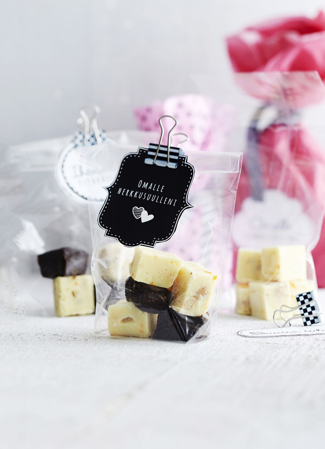 - Säilytä fudget tiiviissä rasiassa leivinpaperikerrosten välissä tai kääri palat yksittäin leivinpaperiin.