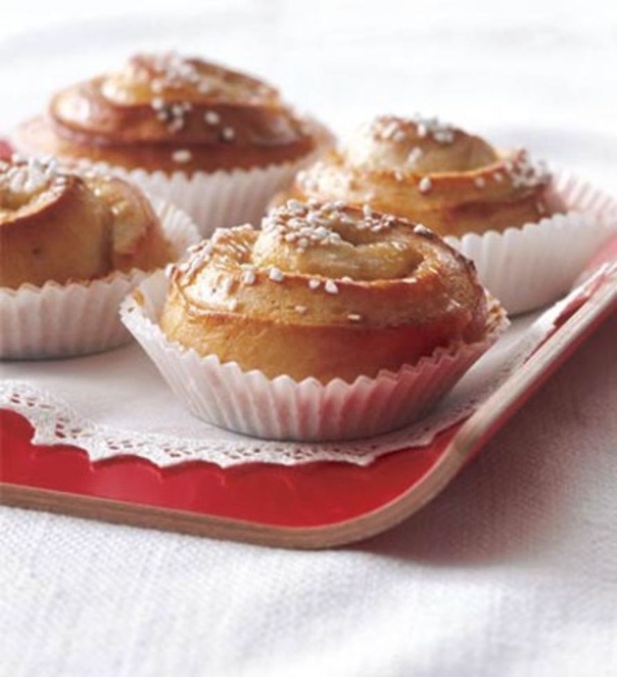 - Kierrä levyt napakalle rullalle. Leikkaa rullasta noin kolmen sentin paksuisia paloja ja nosta palat paperisiin pullavuokiin. Kohota liinan alla. Voitele munalla ja ripottele päälle raesokeria.