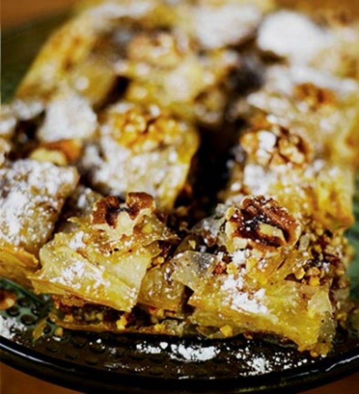 - Leikkaa baklava vuoassaan neliöiksi pohjaan saakka ja kaada siirappi baklavan päälle. Peitä kelmulla ja anna vetäytyä jääkaapissa vähintään 2 tuntia. Tarjoa kahvin kanssa.