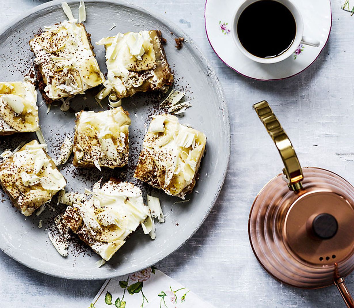 - Vatkaa kerma löysäksi vaahdoksi ja sekoita mascarponeen. Levitä toffeen päälle. Lado päälle viipaloidut banaanit ja koristele valkosuklaalastuilla.