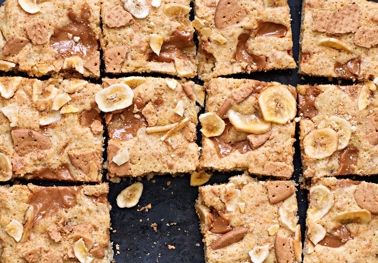 Toffeenokareilla mehevöitetyt banaanikakkupalat on höystetty keksimurskalla. Kuivatut banaanilastut antavat lisää rapeutta.