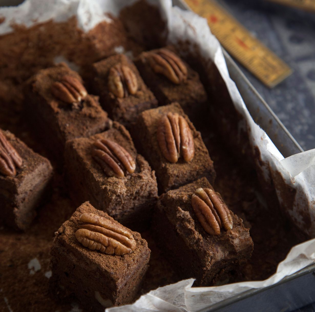 - Levitä kuorrutus jäähtyneelle pohjalle. Leikkaa kakkulevystä noin 6 x 3 cm:n neliöitä. Koristele halutessasi pekaanipähkinöillä.
