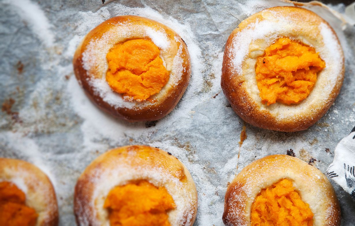 - Paina kohonneisiin pulliin jauhotetulla juomalasin pohjalla laakea kuoppa. Jaa bataattitäyte pullille, voitele reunat ja ripottele sokeria reunoille. Paista pullia 10–12 minuuttia.