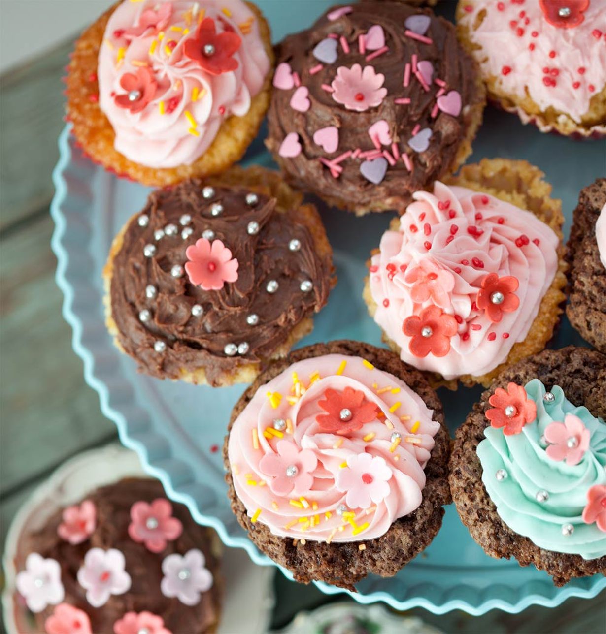 - Levitä tai pursota suklaakuorrutetta tai pastellikuorrutetta kuppikakkujen päälle. Aloita ulkoreunasta ja etene kohti keskustaa. Koristele strösseleillä.