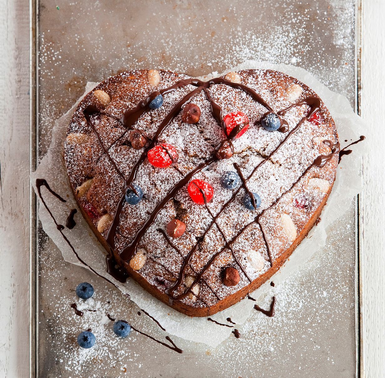 - Koristele kakku sulatetulla suklaalla, säilötyillä kirsikoilla ja pähkinöillä.