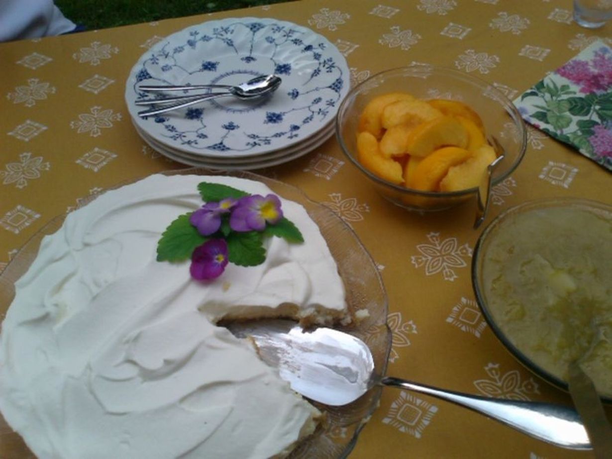 - Paista kakkua uunin keskitasolla 200 asteessa noin 20 minuuttia, kunnes täyte on hyytynyt. Pinta ei saa ruskistua. Kakku tuntuu löysältä uunista ottamisen jälkeen, koska se on kuuma.