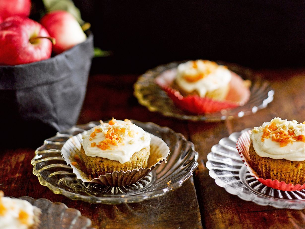 Nämä syksyiset muffinit maustetaan kanelilla, inkiväärillä, kardemummalla ja muskottipähkinällä. Omena ja porkkana lisätään raasteena. Muffinien herkullinen kuorrutus sekoitetaan halvasta ja tuorejuustosta.