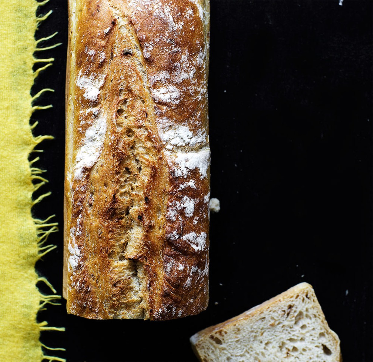 Leivo kaksi pitkulaista tai pyöreää leipää. Kohota leipiä voidelluissa leipävuoissa ja pyöreitä uunipellillä leivinpaperin päällä noin tunti. Voitele leivät vedellä ja ripottele päälle halutessasi vähän jauhoja. Vedä kohonneiden leipien päälle viillot sahateräisellä veitsellä. Ripottele pinnalle halutessasi siemeniä.