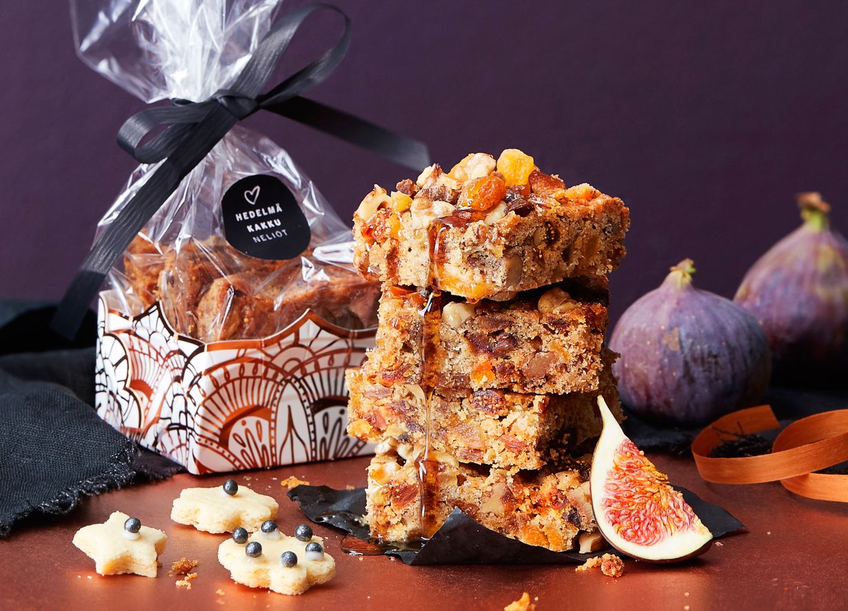 Joulun mehevin hedelmäkakku paistetaan nyt pellillä. Hedelmiä ja pähkinöitä riittää kakun sisälle ja päälle. Riittoisa ja hyvin säilyvä kakku on myös oivallinen pikkujoulukauden tuliainen!