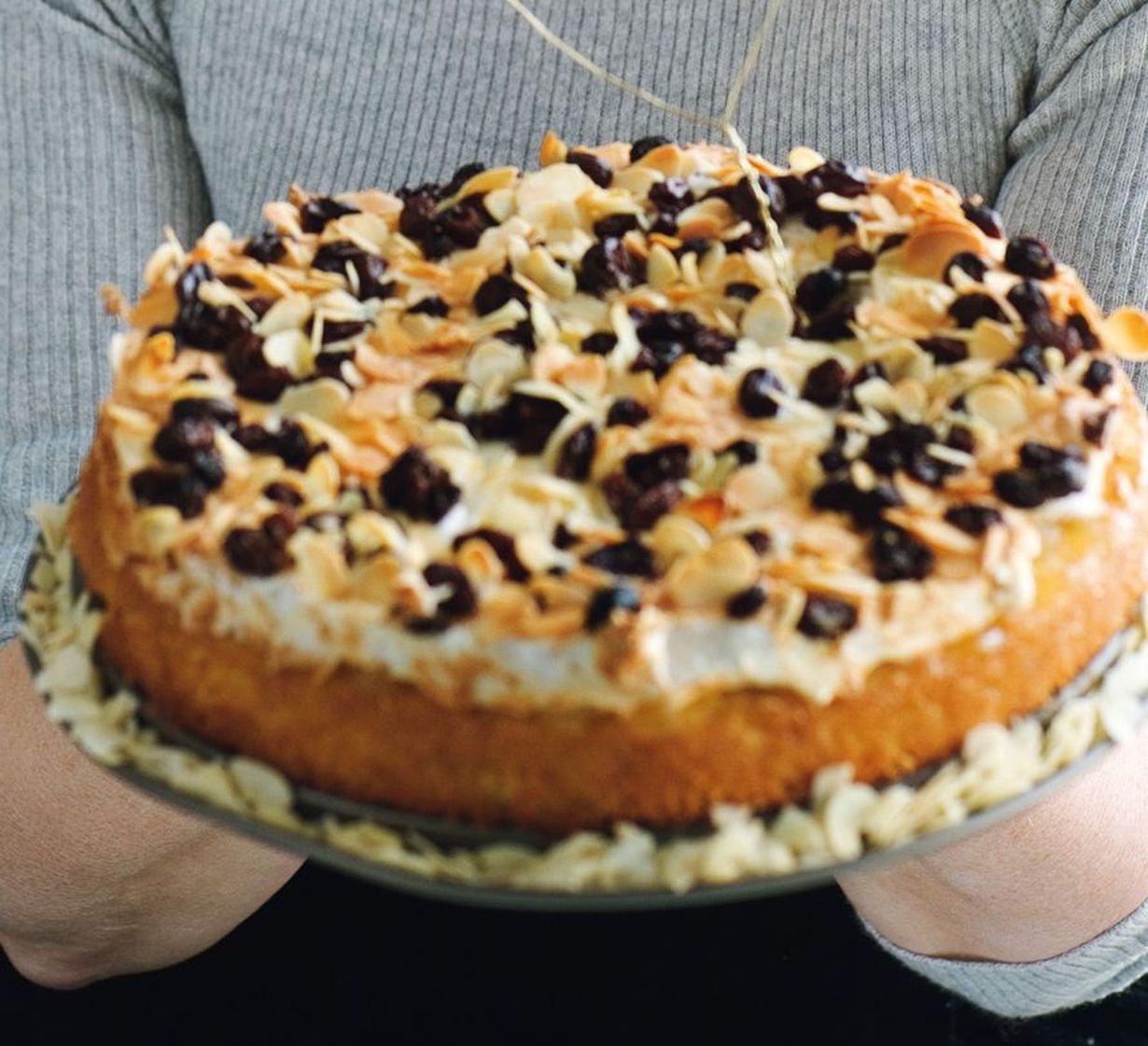 - Vatkaa valkuaiset ja sokeri napakaksi vaahdoksi. Levitä vaahto lusikalla marmeladikerroksen päälle. Ripottele pinnalle rusinat ja mantelilastut.