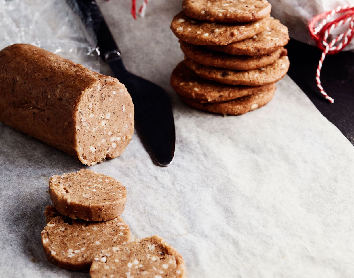 - Leikkaa pötköstä terävällä veitsellä ohuita kiekkoja suoraan leivinpaperin päälle uunipellille.