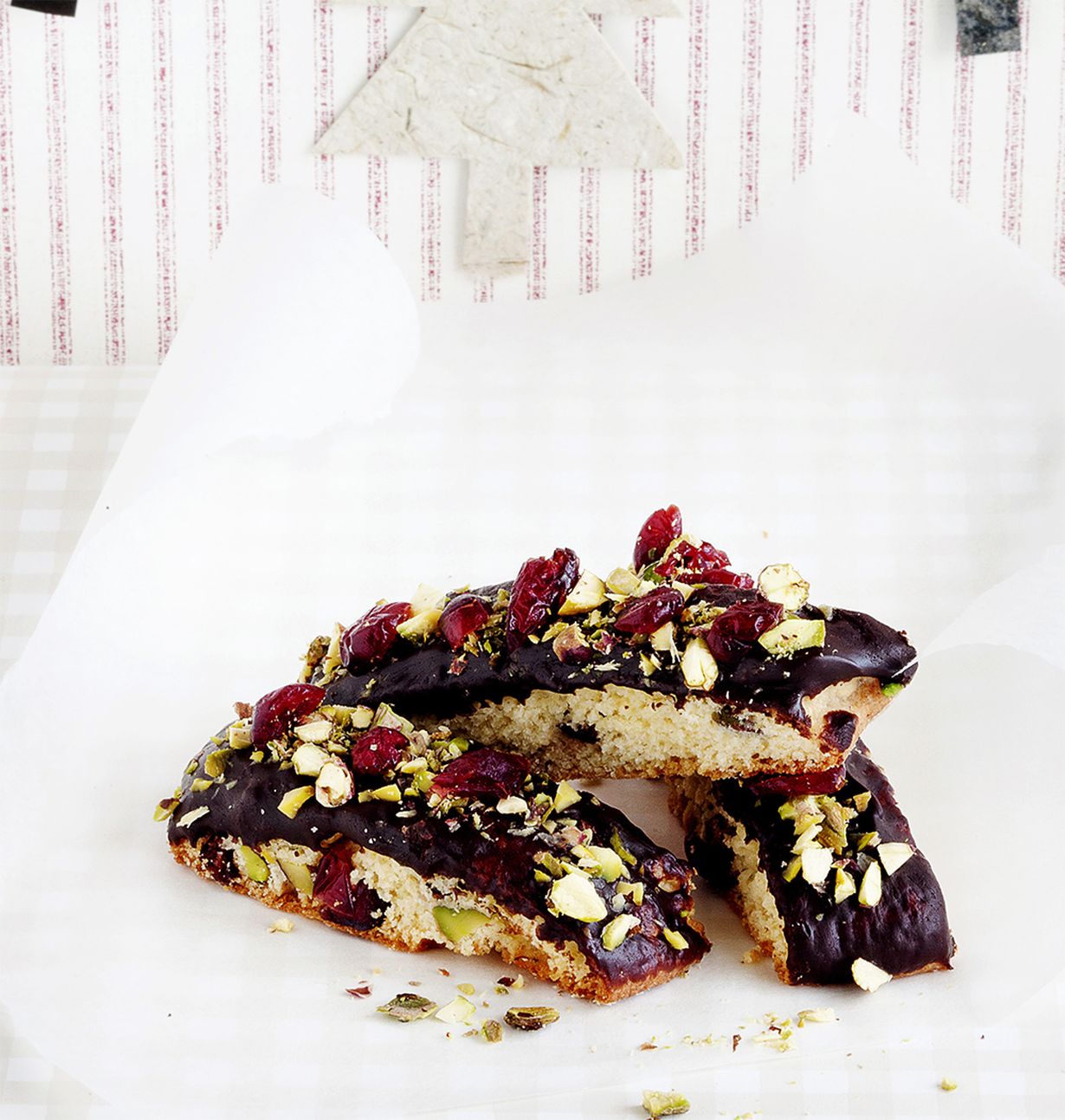 - Kuumenna kerma ja sulata suklaa sekaan. Jäähdytä hetki. Kasta tangot yksi kerrallaan suklaaseen. Koristele pistaaseilla ja marjoilla. Anna kovettua jääkaapissa.