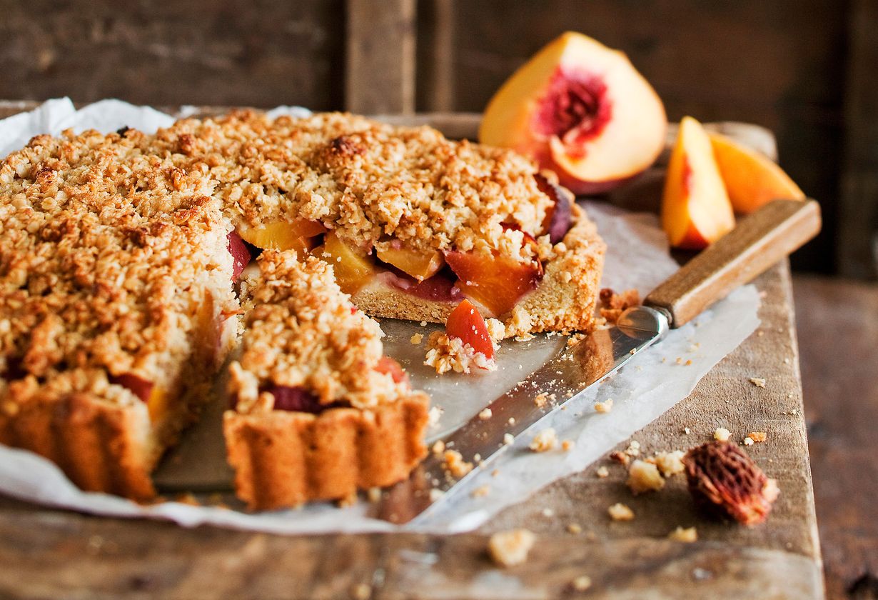 - Paista piirakkaa 200 asteessa puoli tuntia. Kokeile persikoiden kypsyyttä tikulla. Jos pinta tummuu liikaa, laske lämpö 180 asteeseen ja laita folio päälle.