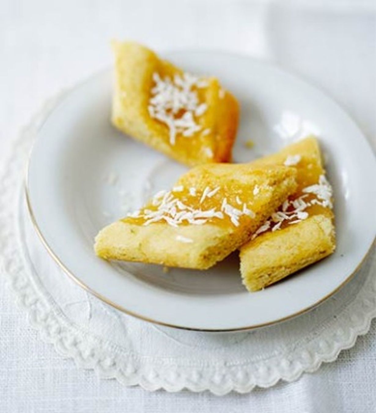 - Sekoita lemon curd -tahna ja perunajauhot keskenään. Levitä tahnaa pikkuleipätaikinan syvennykseen. Ripottele päälle kookoshiutaleita.