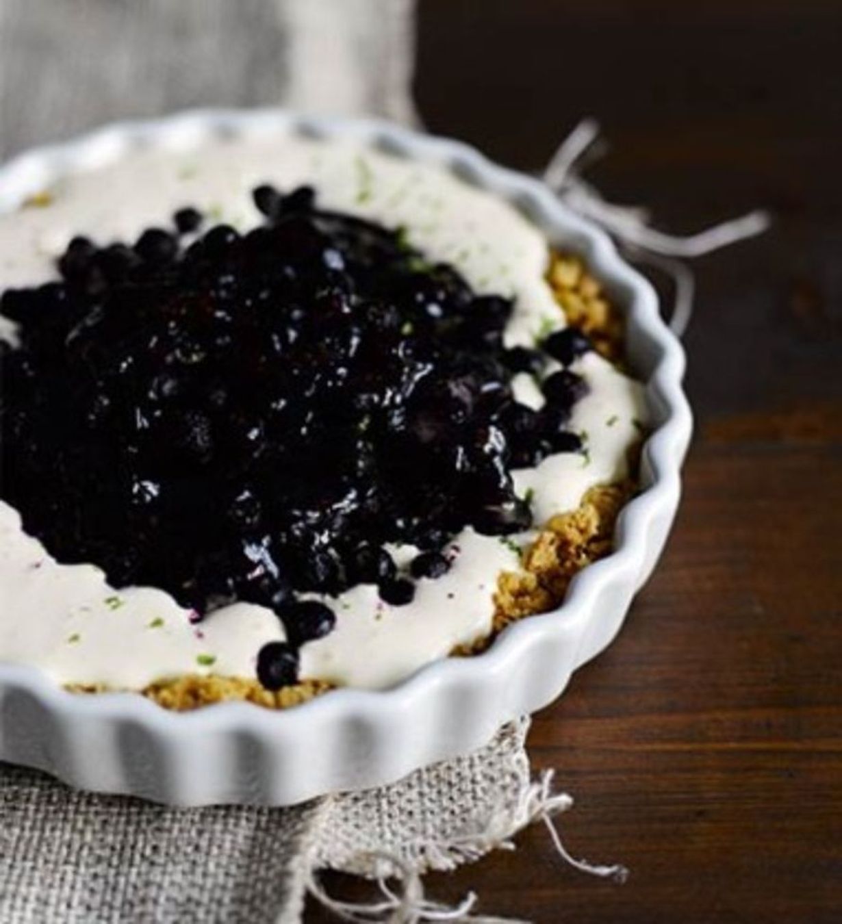 - Mittaa kulhoon ranskankerma, kuohukerma ja muscovadosokeri. Vatkaa sähkövatkaimella, kunnes vaahto on lusikassa pysyvän paksua. Mausta limetin raastetulla kuorella. Kaada seos cookiesmurupohjan päälle. Lusikoi täytteen päälle pakastemustikoita.