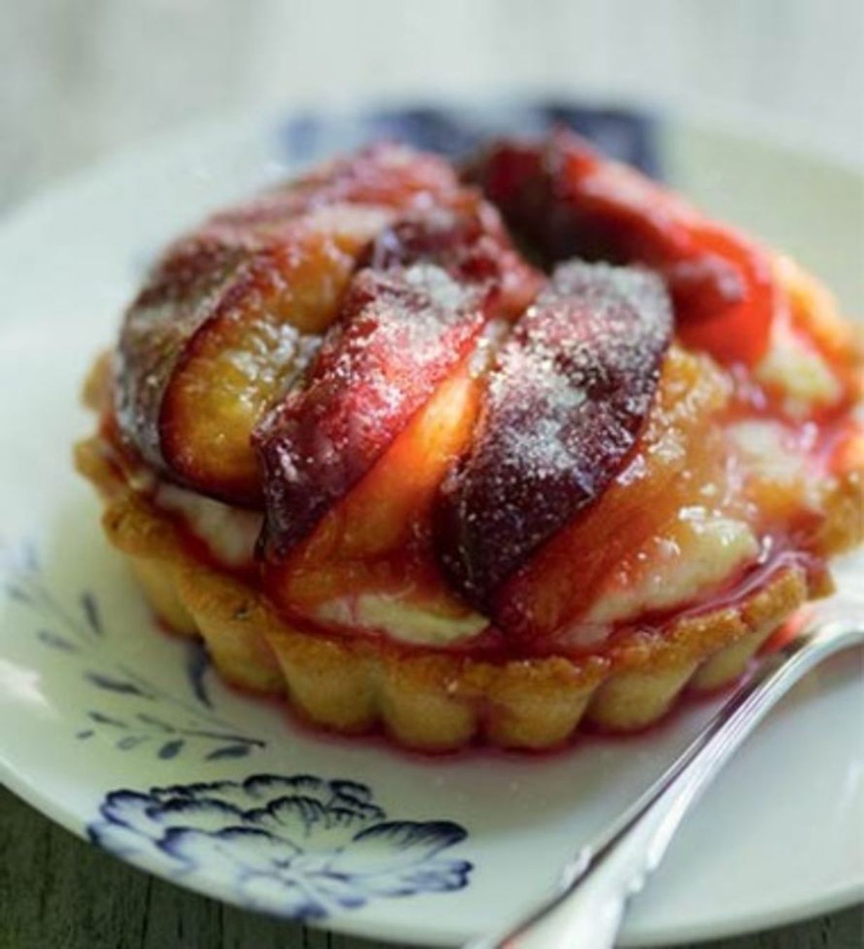 - Levitä vaniljakiisseliä tartelettipohjille ja levitä paistetut luumut päälle. Ripottele pinnalle sokeria.