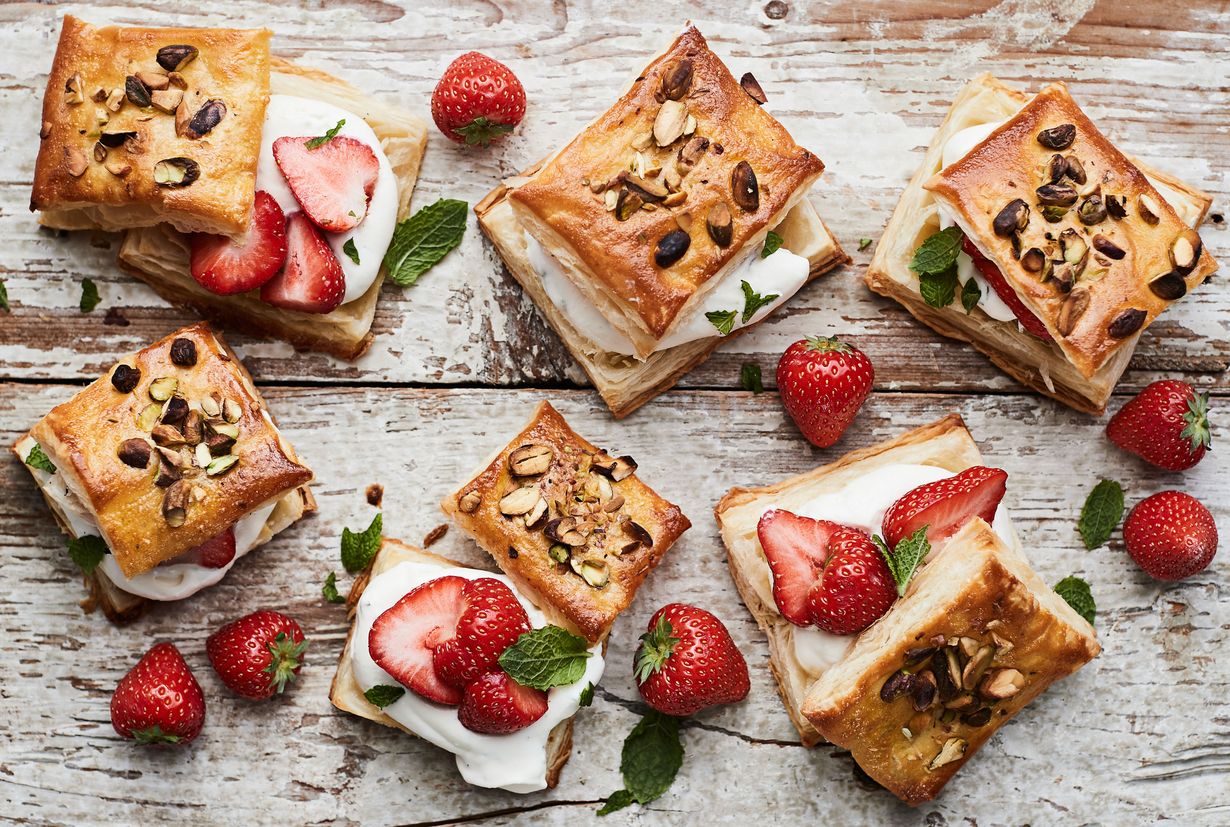 - Halkaise voitaikinalevyt terävällä veitsellä. Levitä väliin vuohenjuusto-kermavaahtoa ja mansikoita. Nosta voitaikinalevyn hattu päälle.