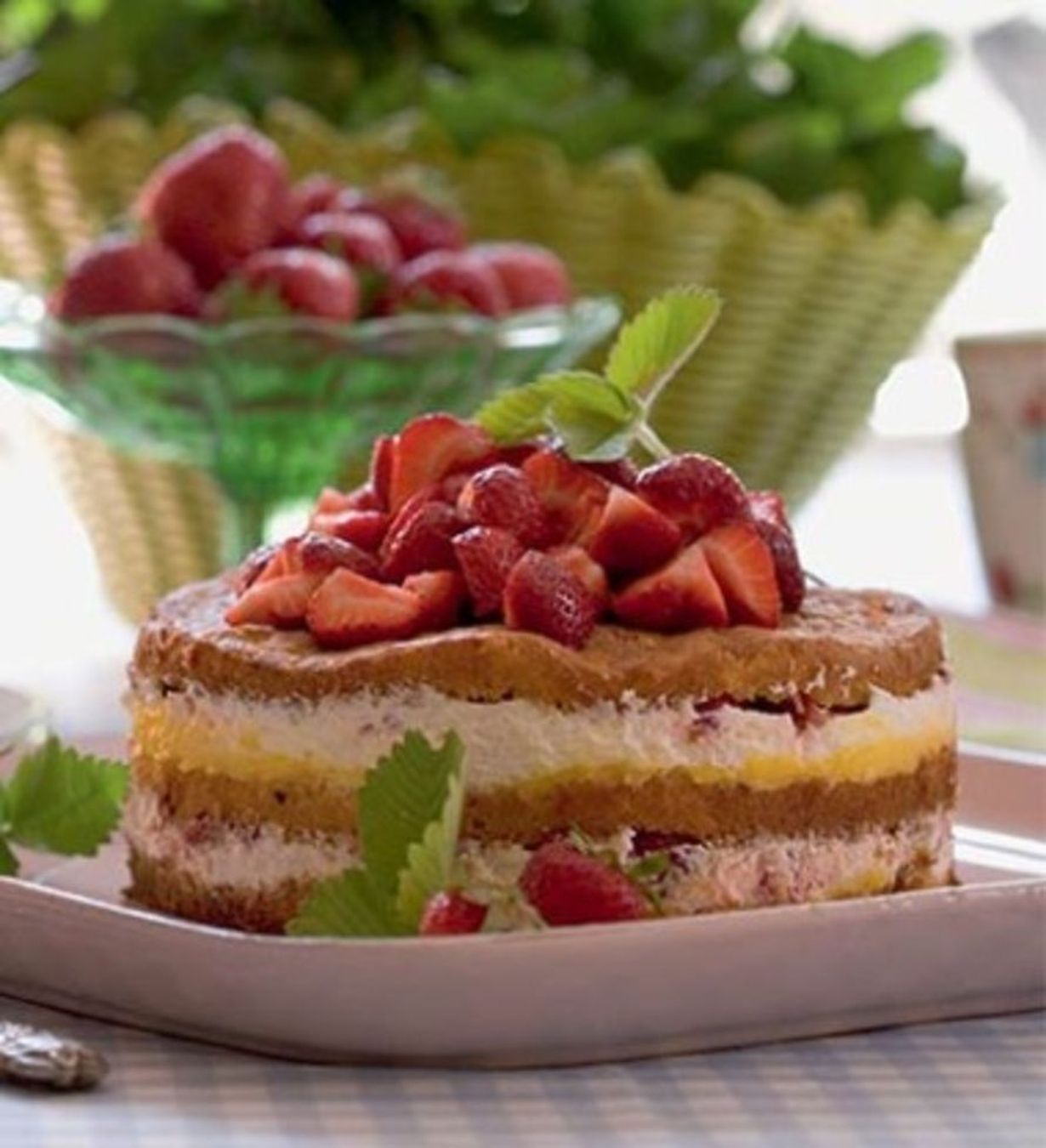 - Täytettä varten vaahdota kerma sokerin kanssa napakaksi vaahdoksi. Kostuta kakkupohjat maidolla tai mehulla. Kostuta myös kakun kansilevy. Levitä alimmalle levylle kerros lemon curdia, sen päälle reilusti kermavaahtoa ja kerman päälle pilkottuja mansikoita. Täytä toinen väli samalla tavalla. Koristele kakun pinta mansikanpaloilla.
