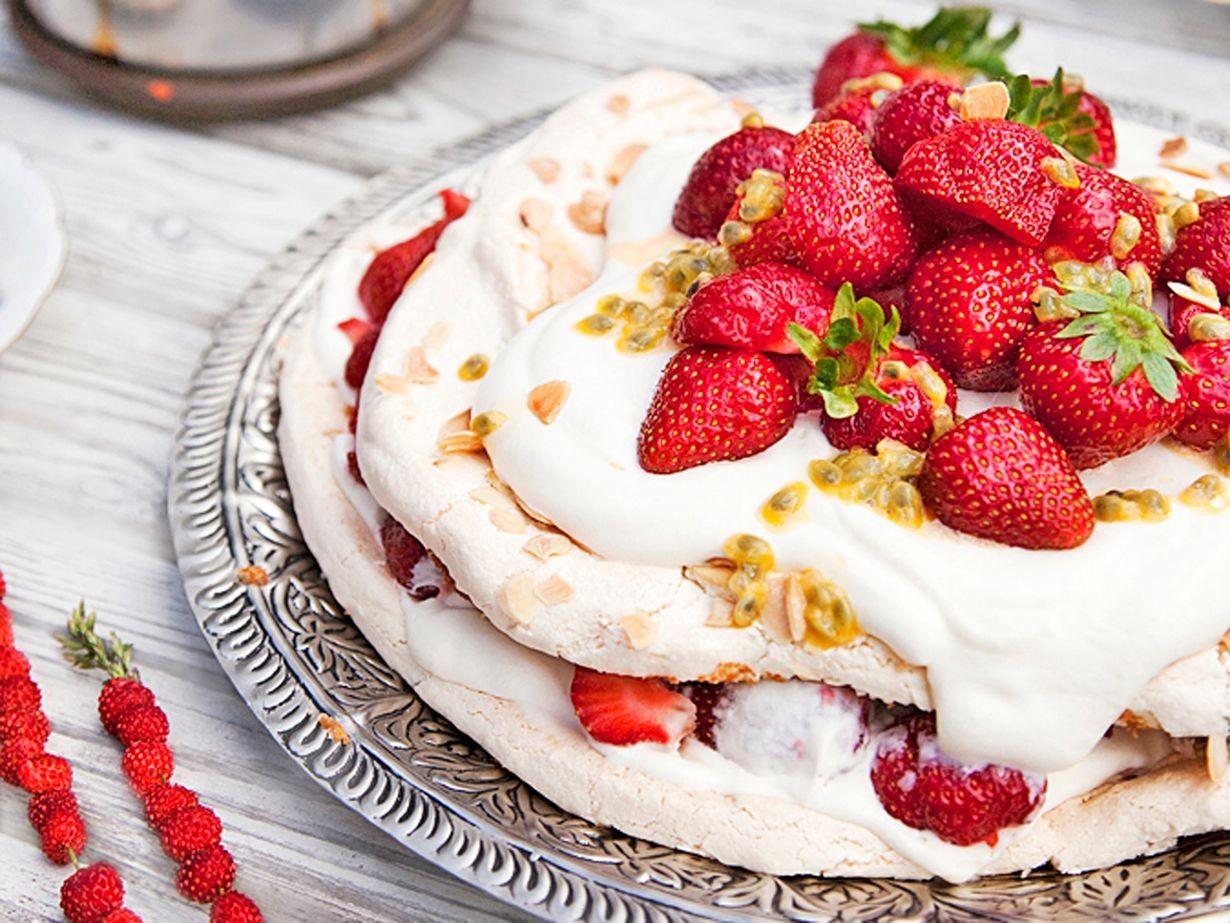 - Levitä jäähtyneen pohjan päälle kermavaahtoa ja tuoreita mansikoita sekä puristettu passionhedelmä. Jos teet kaksi pyöreää pohjaa, laita täytettä myös niiden väliin.
