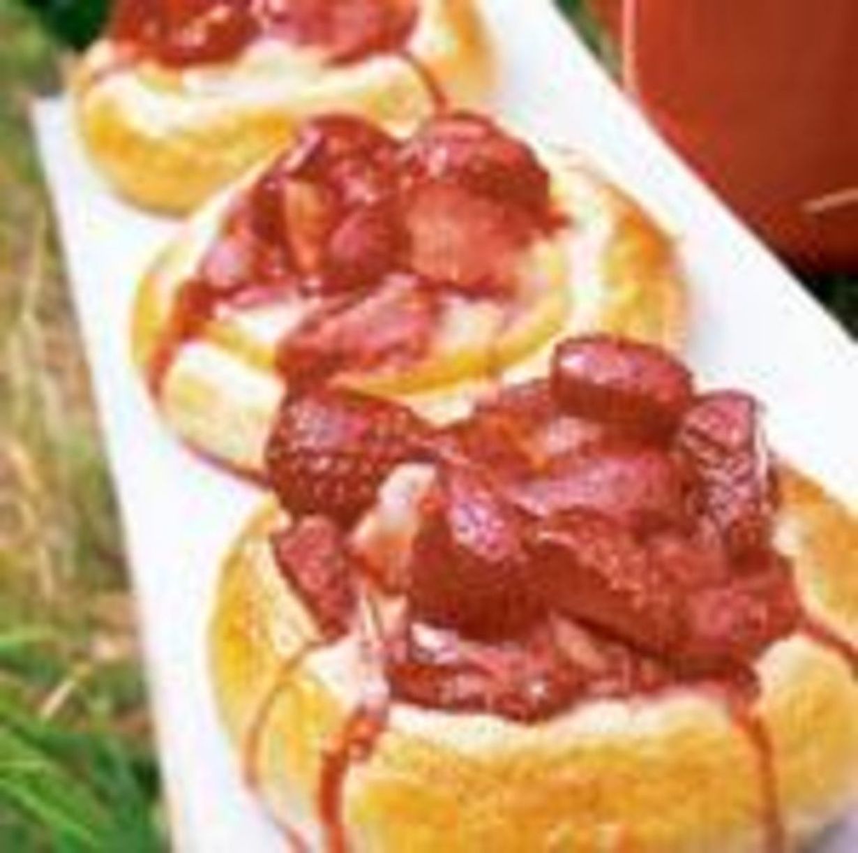 - Lusikoi reilu ruokalusikallinen vaniljakiisseliä syvennykseen ja sen päälle reilusti mansikoita. Ripottele mansikoiden päälle sokeria. Voitele reunat munalla ja paista uunin keskitasolla 225 asteessa 12-15 minuuttia.