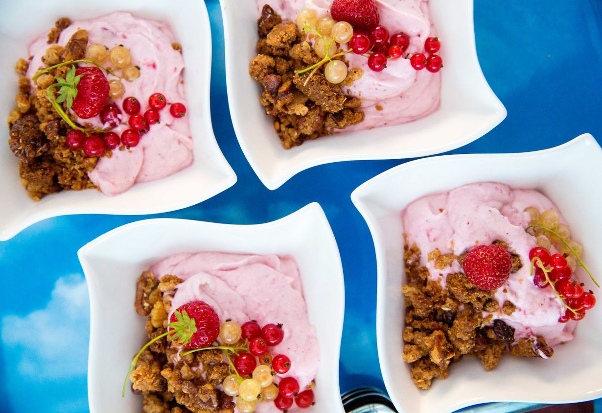 - Annostele täytettä jälkiruokakulhoihin ja siirrä kylmään odottamaan tarjoilua. Koristele annokset juuri ennen tarjoilua muruilla, tuoreilla mansikoilla sekä syötävillä kukilla ja yrteillä.