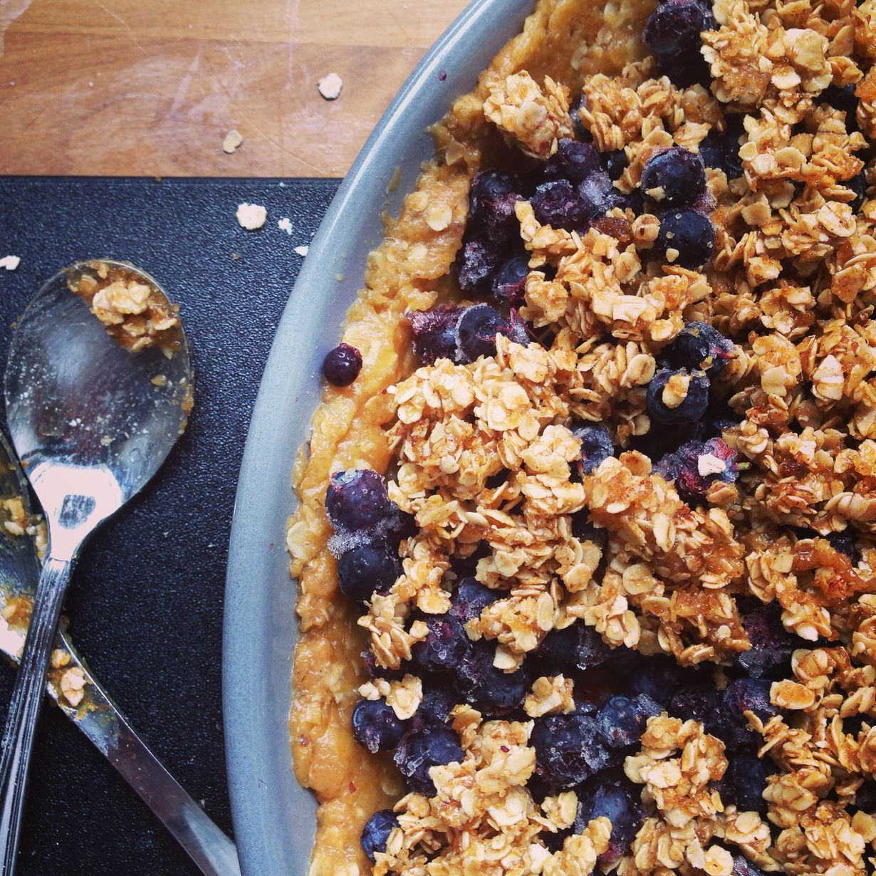 Helppo ja nopea mustikkapiirakka on melkein superruokaa, onhan siinä reilusti mustikoita ja kauraa.