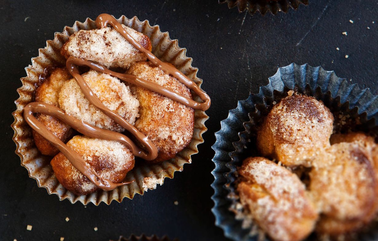 - Kasta pallerot ensin voisulassa, pyöräytä ne sitten kaneli-sokerissa ja nosta muutama pala jokaiseen muffinivuokaan. Kun pohja on peitossa, valuta mikrossa pehmennettyä Nutellaa sekaan pikkulusikalla. Lisää muutama taikinapallo. Jos voita ja sokeriseosta jää yli, yhdistä ne ja lorauta pullien päälle. Kohota leivonnaisia 20 minuuttia.