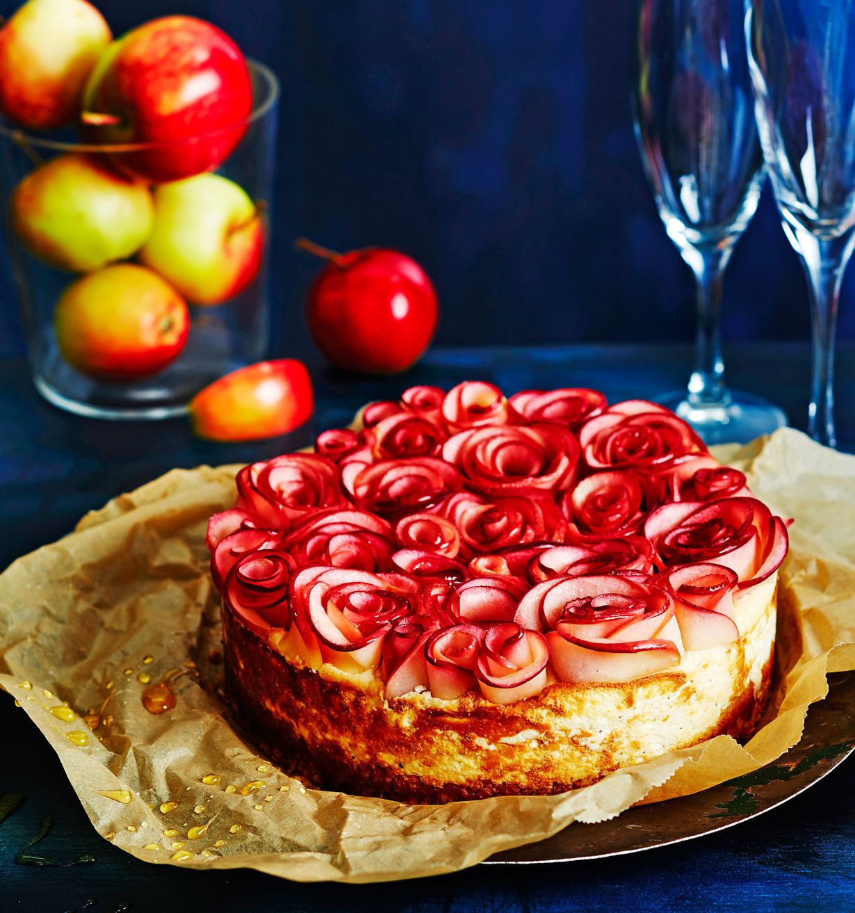 Omenaviipaleet taipuvat ruusuksi tämän hurmaavan juustokakun päälle.